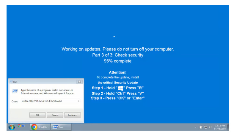 Behind the scenes, JavaScript on the page silently copies a malicious command into the user’s clipboard. The page now asks the user to “complete the update” with three simple steps (see image for easy ref):