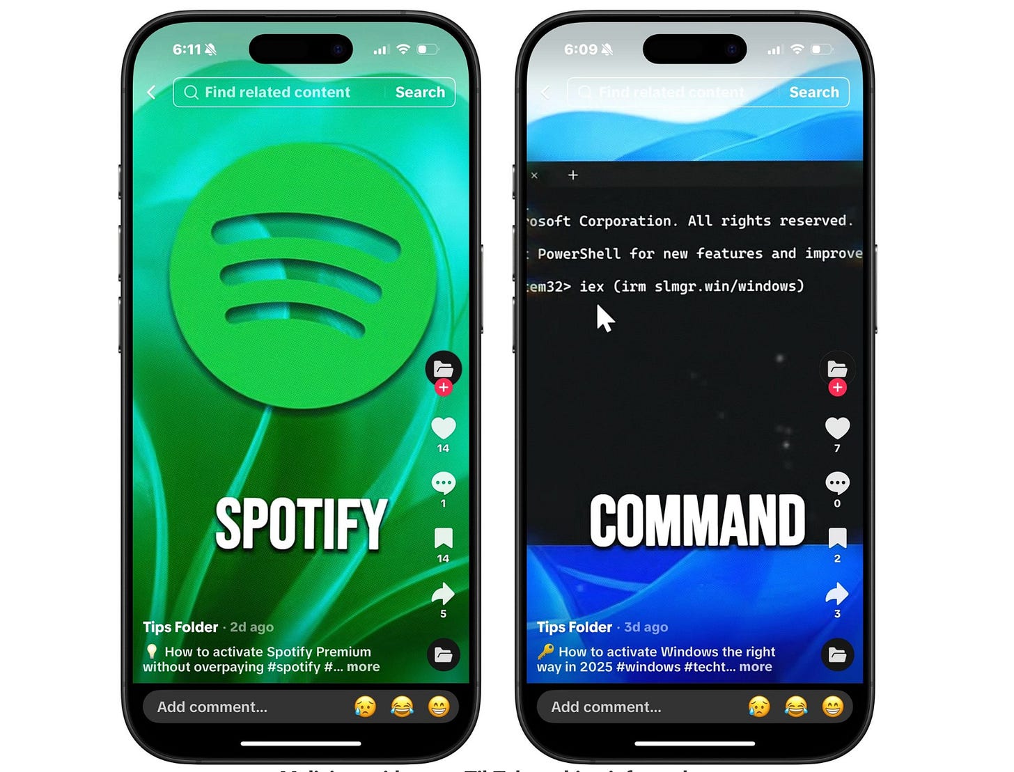 Attacker posts a TikTok video promising free access to licensed programs (ex: Adobe Photoshop, Microsoft Windows) with simple steps to activate.